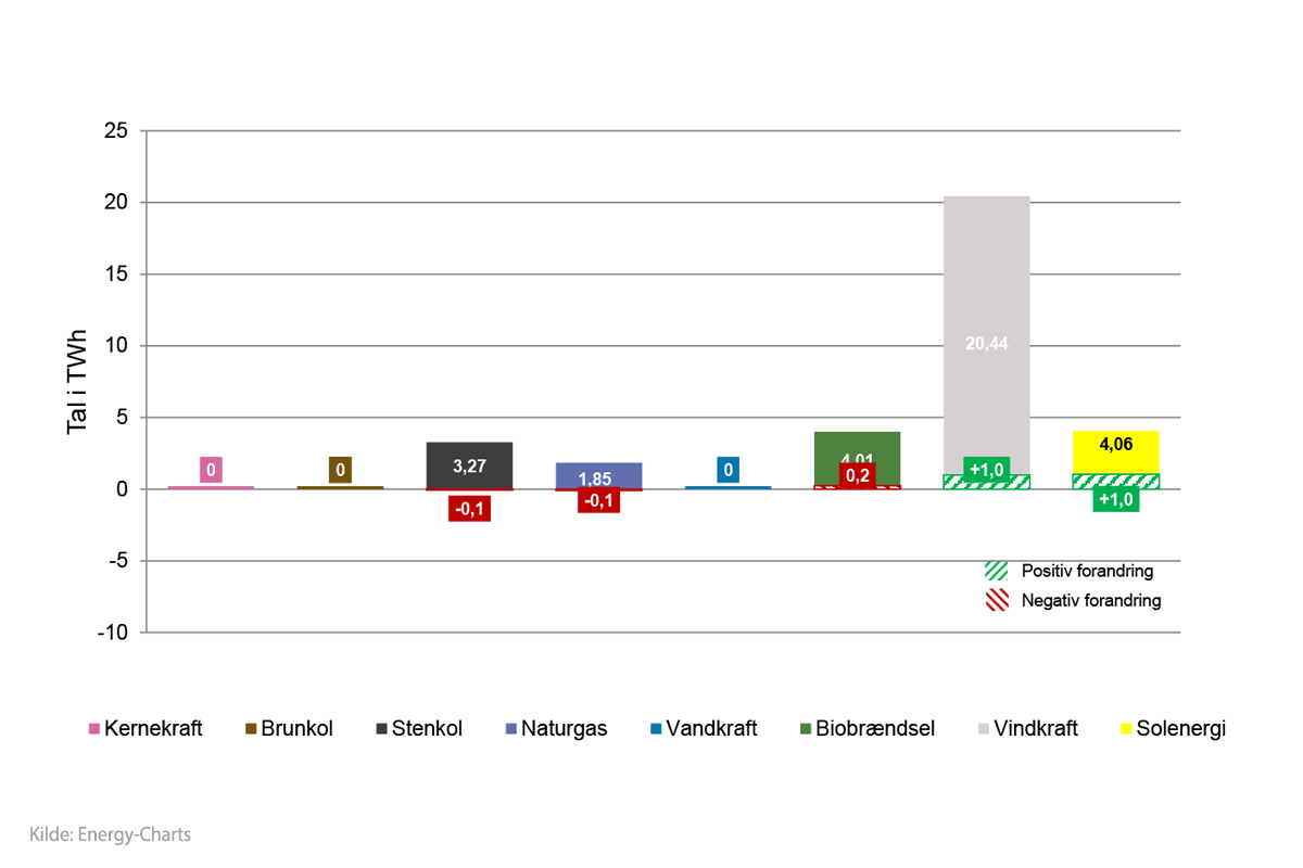 Nettoelproduktion efter energikilde i Danmark med den årlige ændring i 2024