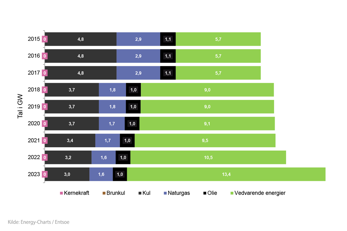 Andelen af vedvarende energi i nettostrømproduktionen, dvs. den strømmix, der faktisk kommer ud af stikkontakten, er steget til over 83 % i 2024. Væksten i solenergi var i 2024 23 % lavere end i 2023.