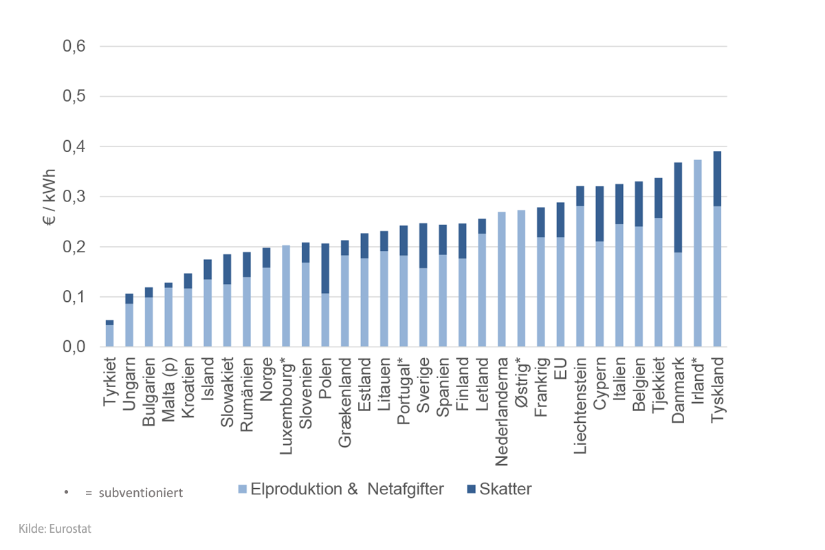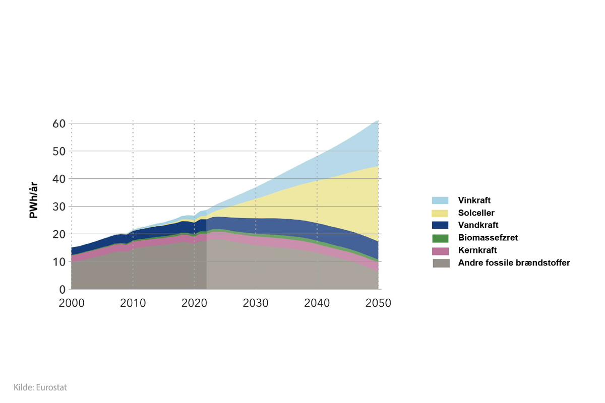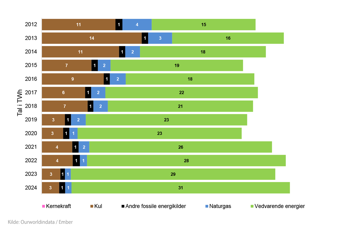 I Danmark produceres elektricitet hovedsageligt fra vind og andre vedvarende energikilder. Der er ingen bruttoelproduktion fra kernekraft. Kul og naturgas som energikilde til elproduktion fortsatte med at falde, og andre fossile brændstoffer forblev stagnerende på et lavt niveau. Samlet set blev der produceret mere elektricitet, end der blev forbrugt i Danmark i 2024.