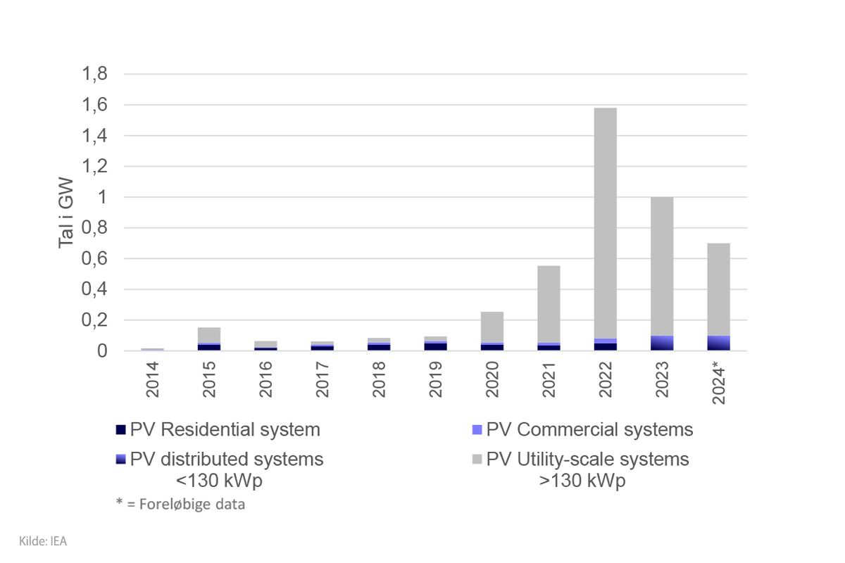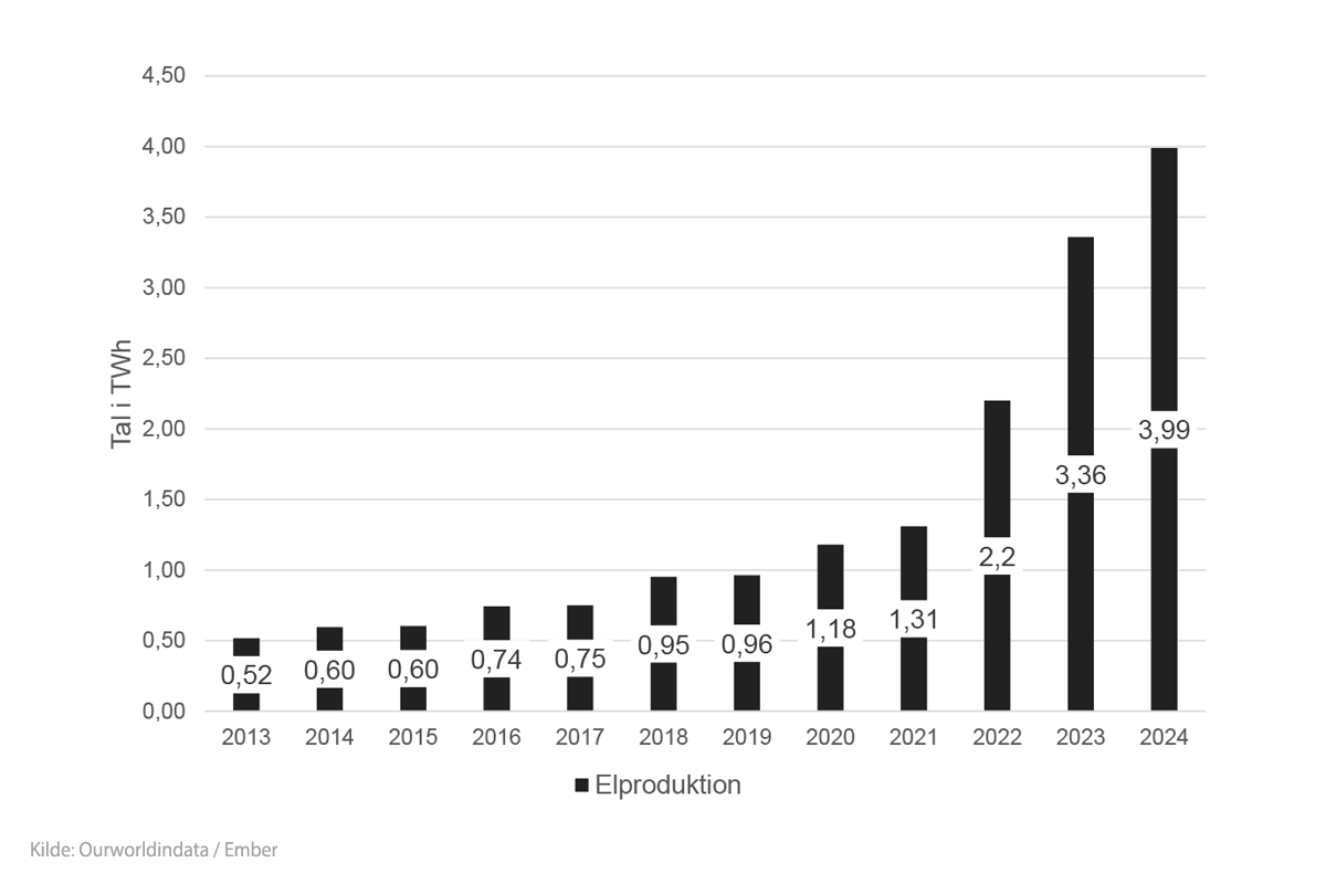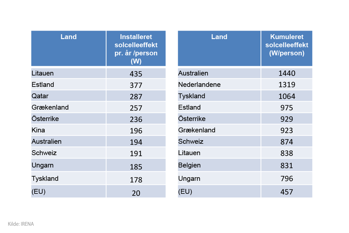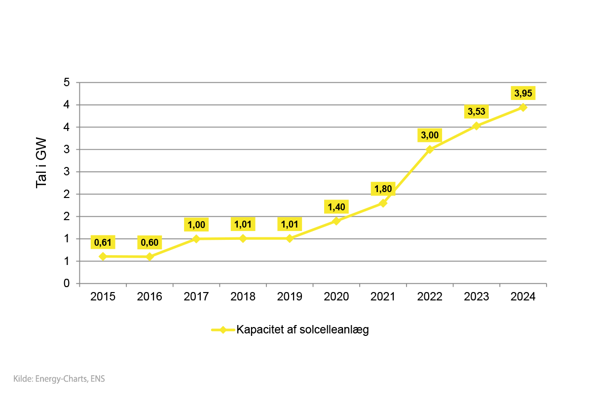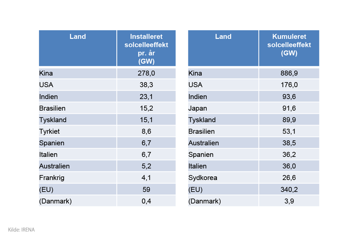 I alt bidrager solcelleanlæg næsten 14 % til den dansk elbehov og næsten 13,5 % i den Europæiske Union.