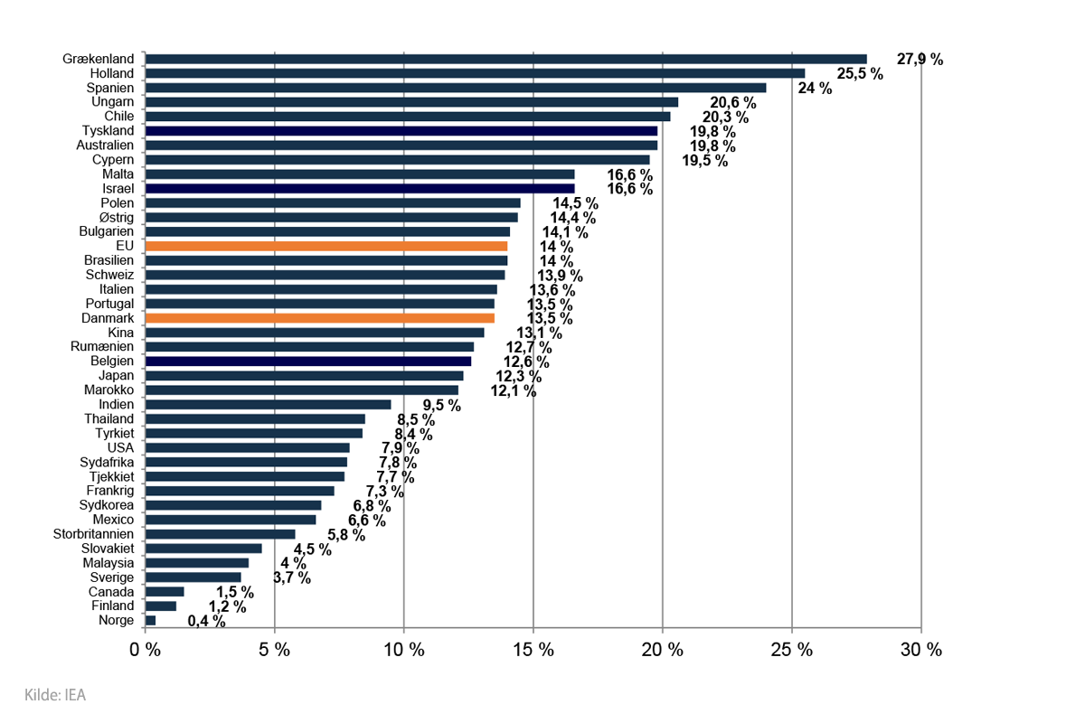 Diagrammet viser den teoretiske andel af el fra solceller i elbehovet i udvalgte lande (IEA PVPS og andere). Den er baseret på den installerede solcelleeffekt indtil 2024.