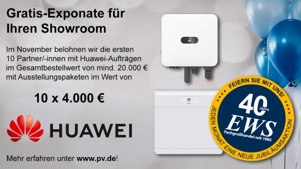 Zum Auftakt präsentiert EWS gemeinsam mit Huawei ein exklusives Angebot für Fachbetriebe. Sichern Sie sich eines von zehn Showroom-Paketen im Wert von je 4.000 € und machen Sie Ihre Kundenberatung zum Erlebnis!