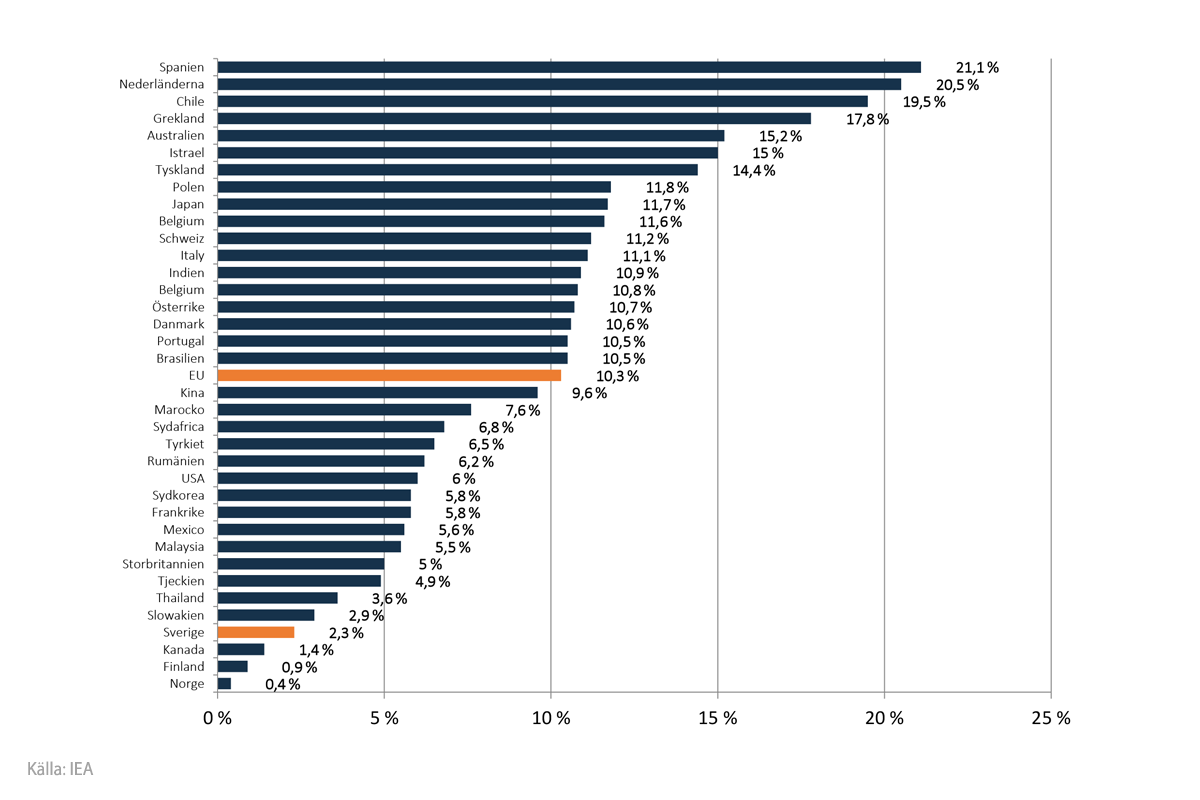 Denna figur visar andelen solel som teoretiskt bidrar till att försörja elbehovet i några utvalda länder (IEA PVPS bl.a.), och baseras på installerad solcellseffekt fram till 2022.